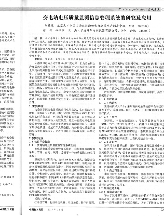 《變電站電壓質(zhì)量監(jiān)測(cè)信息管理系統(tǒng)的研究及應(yīng)用》載于《中國(guó)化工貿(mào)易》2017年第34期