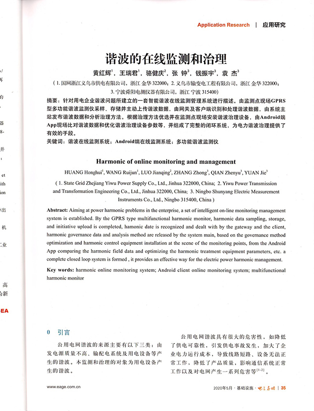 《諧波的在線(xiàn)監(jiān)測(cè)和治理》載于《電氣應(yīng)用》2020年第5期