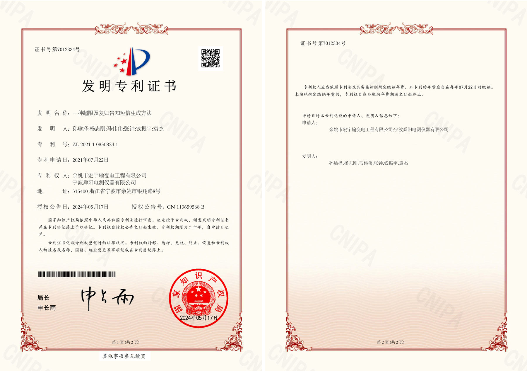 5月26日,我司收到第7012334號發(fā)明證書,表明我司提交的一種超限及復(fù)歸告知短信生成方法的技術(shù)發(fā)明項目審批通過。